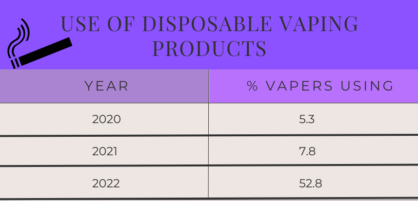 A table showing the % increase of people using vaping products in the UK between 2020-2022
